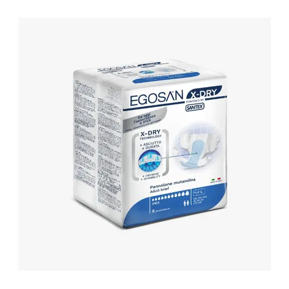| من الآن وداعاً للتسريب والبلل والتغيير المستمر , إليكم حفاضات إيجو سان الايطالية الأفضل و الأكثر امتصاصاً علي مستوي المملكة بتقنية ال X-DRY فائقة الإمتصاص - مخصصة للأشخاص الذين يعانون من سلس البول الذي يؤدي الي عدم التحكم في البول - مزيج مثالي من تقنيات الامتصاص و منع التسرب , حيث أن تكنولوجيا ال X-DRY قادرة علي الاحتفاظ بكميات كبيرة من السوائل لمدة تزيد عن ال8 ساعات وامتصاصها حتي مع وجود ضغط قوي عليها من المريض دون تسريب أو وجود بلل - التركيب الفريد يجعلها أكثر إمتصاصاً في المناطق ذات التدفق الاأكبر و أخف في لأجزاء الخارجية لتقديم أقصي قدر من الراحة ومنع ظهور التهيجات المزعجة علي الجلد - نسيج من القطن لشعور لطيف بالجفاف - حواجز لينة ومرنة فائقة الحماية من التسرب الجانبي - يتم ضمان الملاءمة والالتصاق الجيد من خلال الأشرطة المرنة والأشرطة اللاصقة متوفر بمقاسات مختفلة حسب مقاس الخصر مقاس كبير : 100-150 سم مقاس كبير جدا : 110-165 سم- الموديل: EGOSAN-X DRY |