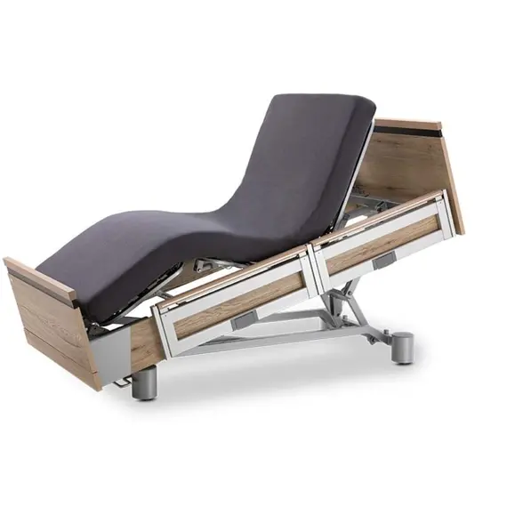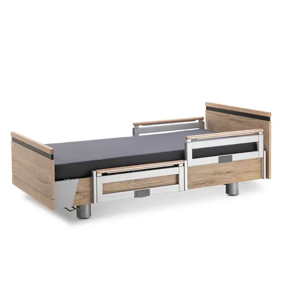 The advantages of the retractable vertical side rail system are its compact design, which does not require any lateral space, and the exceptional stability of the anodised aluminium precision-processed elements. A high-quality solid wood handrail with an edged design strip demonstrates the high quality of the AURA premium care bed.
