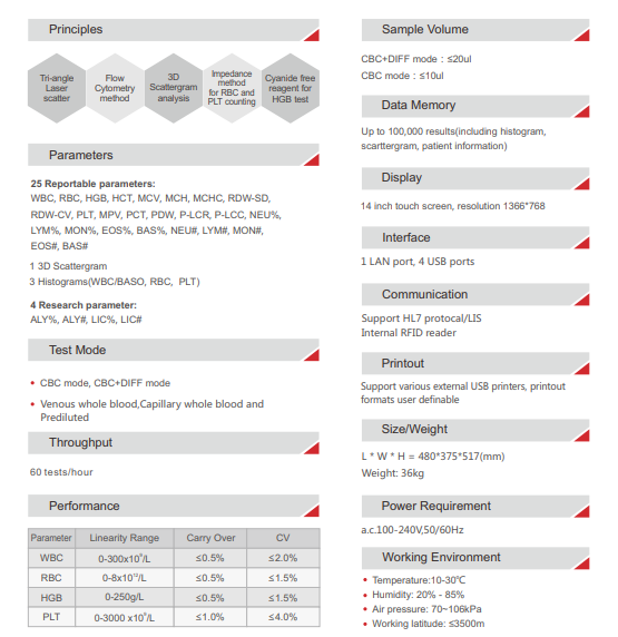 A fully automated 5-part hematology analyzer designed for complete blood count (CBC) analysis. Provides accurate measurement of WBC, RBC, HGB, HCT, PLT, and additional red blood cell indices. Features user-friendly interface, fast processing, and reliable results suitable for clinical laboratories, hospitals, and research facilities. Equipped with quality control and data management functions for optimal workflow.
