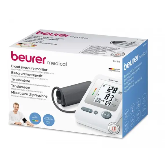 جهاز Beurer BM26 لقياس ضغط الدم هو النموذج التقليدي لأجهزة قياس الضغط العالمية من Beurer بدقتها وكفاءتها المشهورة، حيث حصل جهاز قياس ضغط الدم BM26 has على موافقة من WHO (مؤسسة الصحة العالمية، كما يتميز بقياس تلقائي لضغط الدم والنبضات في أعلى الذراع مع سوار يكفي محيط ذراع من 23-35 سم. ويحتوي جهاز BM26 على 4 x قنوات ذاكرة، يحتوي كل منهما على 30 سعة للذاكرة، كما أنه مزود بحافظة عملية للسفر أو للحفظ ودليل مستخدم بسيط للاستخدام.