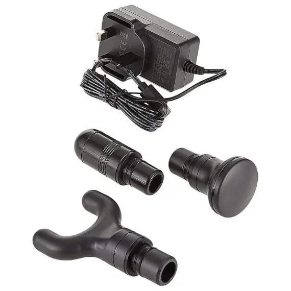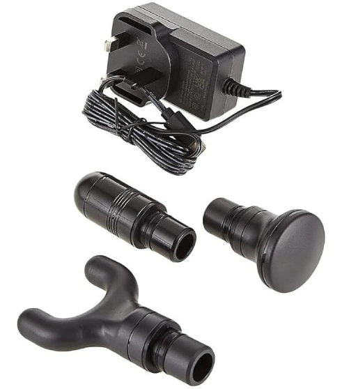 4 interchangeable massage heads: 6 attachment heads for easy access to trigger points and stimulation. Ball head for massaging large areas and muscle groups. Small round head for massaging small areas and muscle groups. Bullet head for deep tissue massage and targeted spot massage. Fork head for muscle tissue massage.