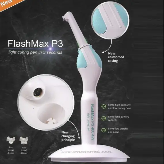 FlashMaxP3 cures composites that use camphor quinone as a photoinitiator. Orthodontic bonding. FlashMaxP3 with an output power of up to 4000 mW/cm2 cures each layer of composite in 1 second and the final layer in 3 seconds. FlashMax P3 features are in conformity with ISO10650 for curing lights