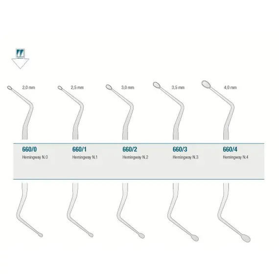 Double-ended Hemingway Bone Curette is a debulking instrument used in small bone and periodontal procedures. It features oval, cupped tips with sharp edges used to scrape away bone fragments.