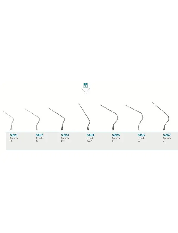 SPREADER: recognizable from its pointed tip and its stem, which is bended in many different ranges. The spreader is mostly used for the following applications: cold working to laterally compact the guttaperca into the endodontic canal; heat carrier to carry the heat into the endodontic canal through a previously heated tip.