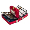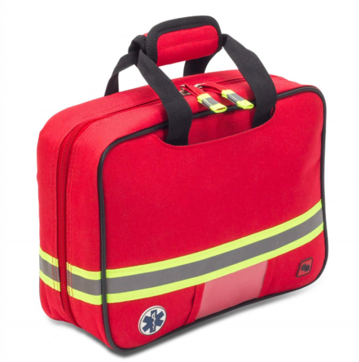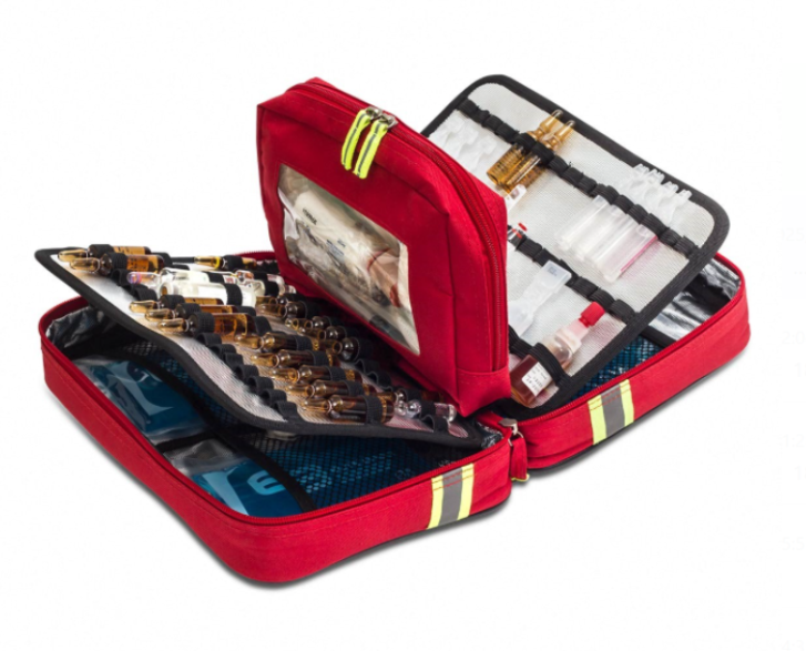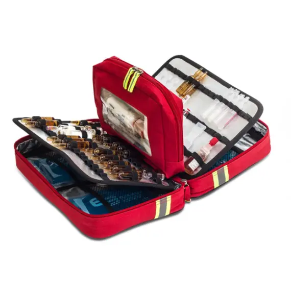 This is a large ampoule holder that allows the user to carry a large quantity of ampoules or medications. Thanks to two detachable trays with labels, healthcare professionals will reduce the time it takes to locate and administer medications, thus providing better assistance to the patient. Reflective zippers for day/night visibility (allows for faster opening). Padded handle. Card holder on the front of the bag. Side mesh and insulating pockets. Contains Probe's On two detachable trays to hold a total of 68 units Small, 52 medium, 368 large, and 2 extra-large units. It also includes an internal pocket with additional material and four mesh pockets for cold gels. A removable central compartment with a clear window accommodates injections, tourniquets, gauze, etc. Four mesh pockets on the sides are also available for cold gels.
