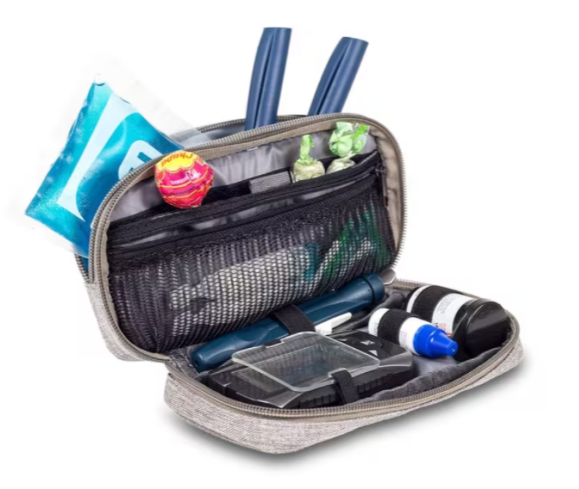 - Flexible fasteners secure test strip bottles, insulin pens, and a blood glucose meter (with a screen protector).
