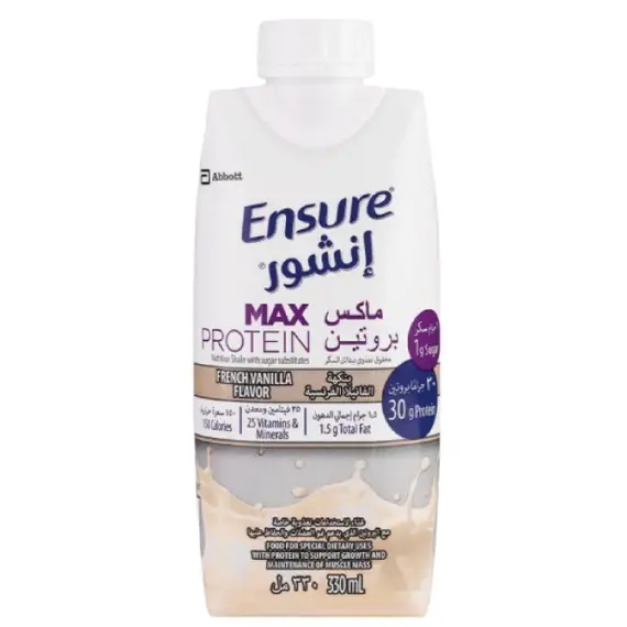 حليب انشورماكس بروتين مكمل غذائي بنكهة الفانيلا ( Ensure MAX 330ml ) الكرتون عبوة 18 حبة
