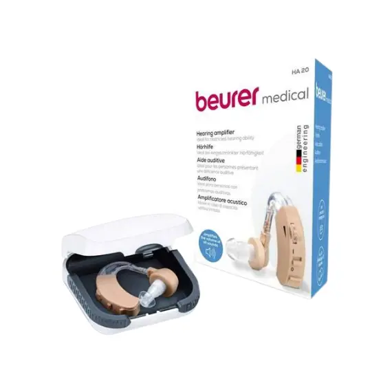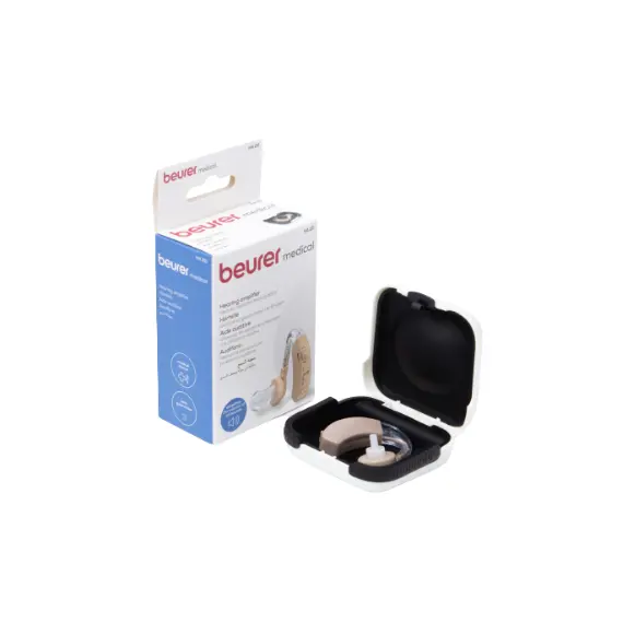 سماعة يتم ارتداؤها خلف الأذن. مناسبة بشكل خاص للأشخاص الذين يعانون من ضعف السمع، حيث تقوم بتضخيم حجم الأصوات حول المريض. تصميم السماعة مريح للوضع خلف الأذن، بالإضافة إلى سهولة الوصول إلى جميع أدوات الضبط الخاصة بها. تعمل سماعة الأذن من بيورير على زيادة حجم جميع الأصوات في الغرف المغلقة وفي الهواء الطلق. يمكن التحكم في طول الأنبوب الموصل للأذن حسب الرغبة. مقاس البطارية 13A. زر للتشغيل والتحكم بالصوت والميكروفون. الحد الأقصى لحجم الصوت 128 ديسيبل. التضخيم كحد أقصى 40 ديسيبل. نطاق التردد 200 - 5000 هرتز. صوت واضح، تشويش وضوضاء أقل. الملحقات: ثلاثة مقاسات مختلفة لقطعة البلاستيك داخل الأذن. عدد 2 بطاريات مقاس 13. صندوق للتخزين. دليل الاستخدام. العلامة التجارية Beurer