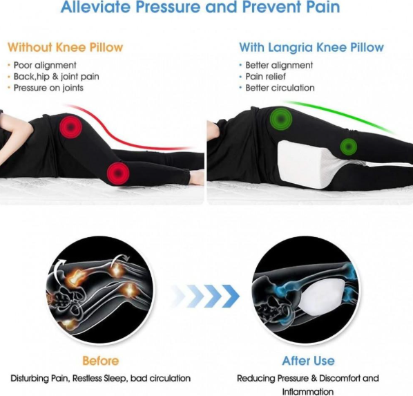 - No more restless nights: Ergonomically curved knee pillows for sleeping conform to the human leg line and keep your legs, hips and spine in perfect alignment while you sleep, improving circulation. The knee wedge pillow is ideal for maternity, hip bursitis, knee arthritis and restless legs syndrome before and after knee and hip replacement surgery.