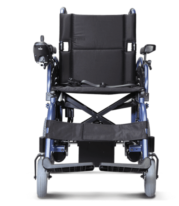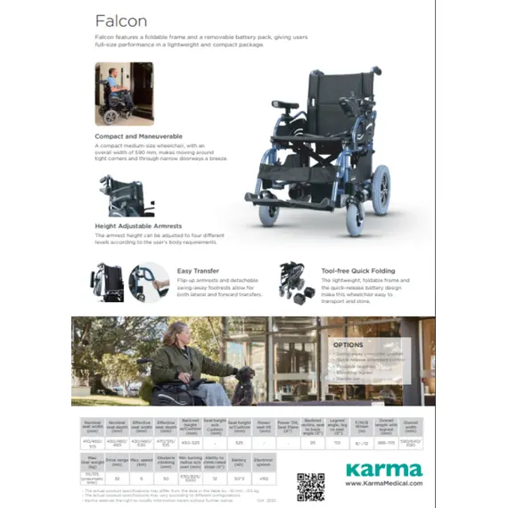 One of the daily challenges faced by electric wheelchair users is maneuvering in and through tight spaces such as doorways and elevators. Most standard electric wheelchairs are 64 cm wide, and since some doorways are as narrow as 71 cm or less, passing through them can be quite difficult. The Falcon is a compact to mid-size wheelchair with an overall width of 59 cm, meaning it can easily maneuver around tight corners and through narrow doorways.