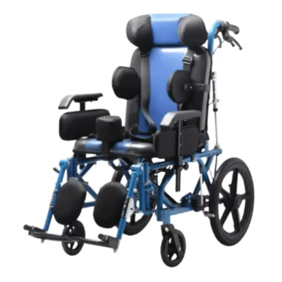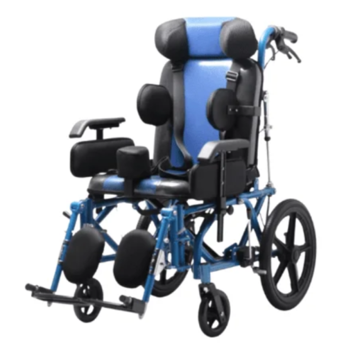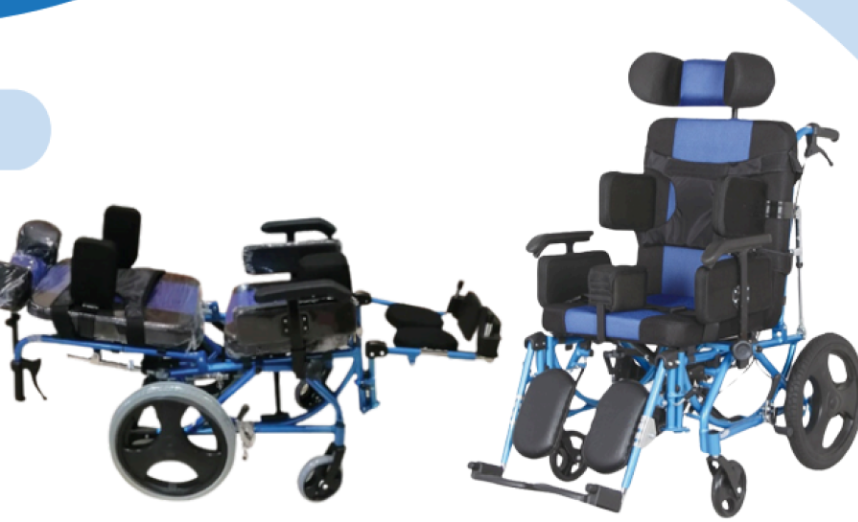 كرسي متحرك خاص بالأطفال ذوي الاعاقة الشديدة بحيث يؤمن الراحة في الجلوس من خلال الدواعم الخاصة بالكرسي و الاسفنج العالي المكون للكرسي . الدواعم المزود بها الكرسي تؤمن ثبات الطفل بالإضافة الى وجود الاحزمة الذي يدعم ذلك .