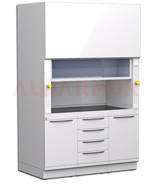 Gas extraction cabinet for health laboratories, featuring an epoxy work surface and drainage basin, lighting, electrical outlets, gas valves, and an extraction fan for fumes. Dimensions: length 150 cm, depth 85 cm, height 270 cm.