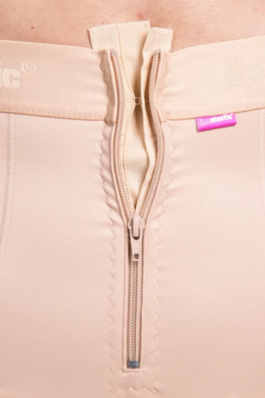 - يوجد سحاب إغلاق في الجزء الأمامي السفلي مع خطافات دعم لتسهيل ارتداء الملابس بعد العملية الجراحية وما بعدها