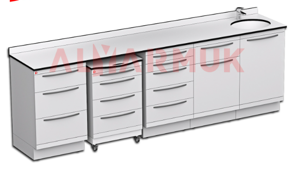Fixed medical bench, 260 cm wide × 87 cm high × 51.6 cm deep, made of rust-resistant galvanized iron with a scratch-resistant, thermal, antibacterial coating, plus a 50 cm mobile unit, Price excludes top, sink, and washbasin.