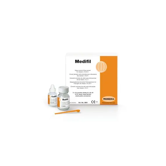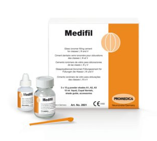 INDICATIONS - For restorations of deciduous teeth (especially class I) - Repair of V-shaped defects and enamel erosions as well as root erosions in the cervical area incl. class V fillings. - Cavities caused by carious lesions -Fillings of class III and small fillings of class I (incl. extended fissure sealing) as well as build-up fillings for crowns, linings ADVANTAGES - Improved glass ionomer technology - Spreadable consistency - Good marginal adaptation - Very good wetting behaviour - Good aesthetics in three Shades - Continuous fluoride relea