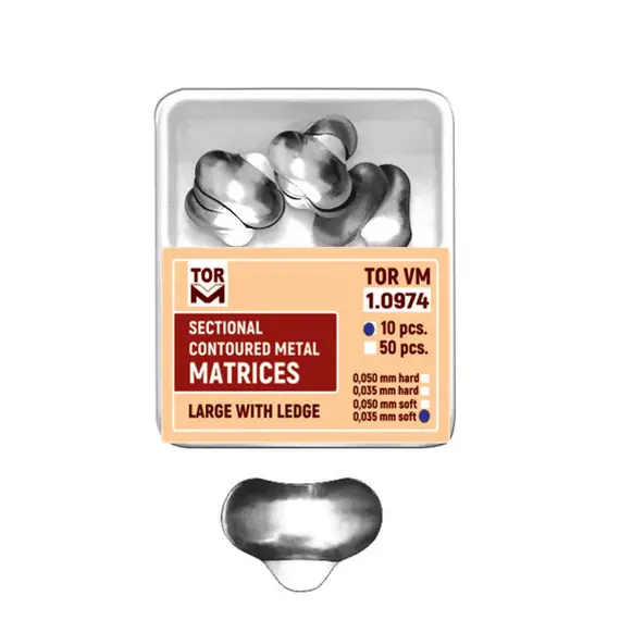 Sectional contoured metal matrices, large with ledge, pack of 10. Designed for precise tooth shaping during restorative procedures. Provides stable placement and clear margin definition, ensuring optimal and consistent filling results with minimal interference or leakage.
