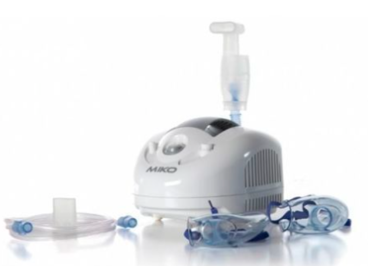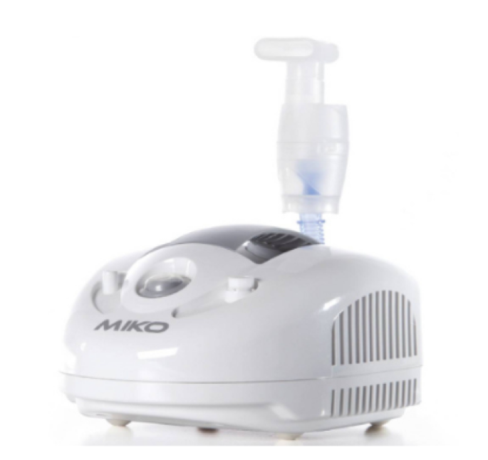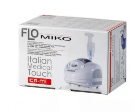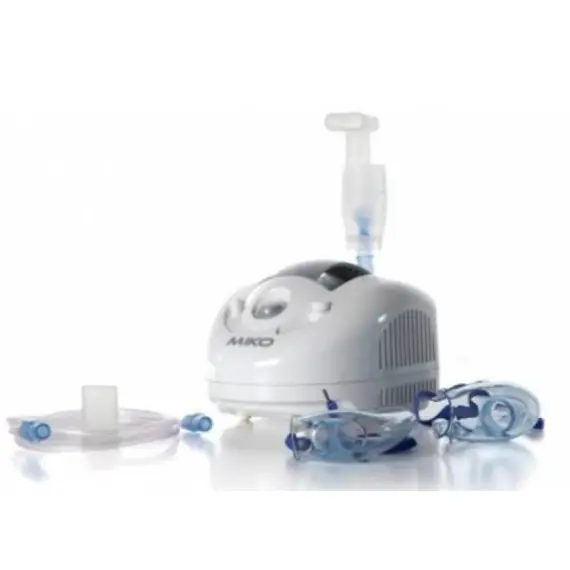 MIKO is a piston-operated nebulizer for spray therapy. Designed for home use, it features a compact size and comes with a carrying case for easy transport of the unit, accessories, and medications. It has recently been upgraded to operate continuously when intensive treatments are required. HI-FLO Jet Nebulizer, Adult Masks with Elastic Strings, Pediatric Masks with Elastic Strings, Mouthpiece, Nosepiece (Non-Surgical), Air Tube, Air Filter, Carrying Case (Miko Model Only), Compressor - Oil-Free, Maintenance-Free Piston Pump, Power Supply - 230V - 50Hz, Power Consumption - 170VA, Maximum Pressure - 2.2 bar 32 psi 220 kPa, Operating Pressure - 0.95 bar 12 psi 80 kPa, Operating Airflow - 4.8 L/min, Breathing Rate with 4 mL Solution - 0.35 mL/min, Average Aerodynamic Diameter (MMAD) - 2.44 µm (mmA), Inhalable Fraction (80%), Warranty - 3 Years, Place of Manufacture - Italy