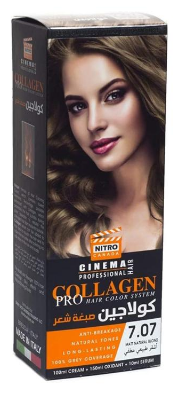 Nitro Canada Cinema Collagen Hair Dye Natural Matte Blonde 7.07 A formula enhanced with collagen that penetrates the hair during the dyeing process to rebuild damaged hair from the inside out.
