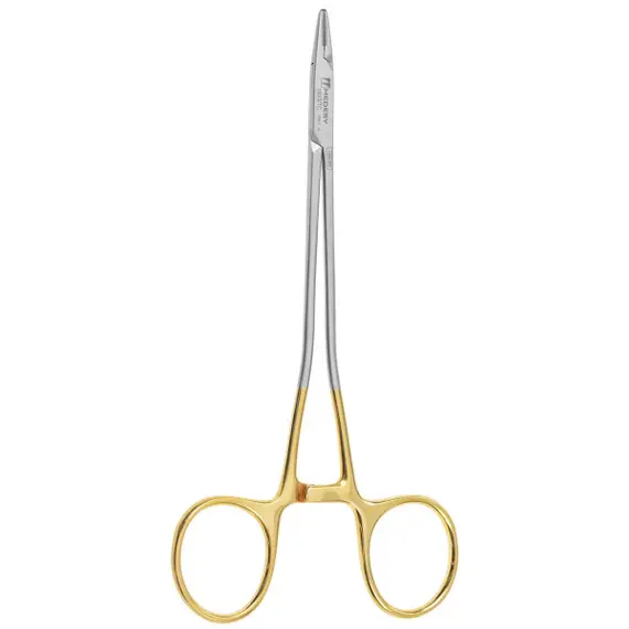 For needles: 5-0, 6-0, 7-0, 8-0 Used to grasp suture needles during suturing when pushing/pulling the needle and suture through tissue. It has short serrated jaws at the distal end to provide better grip of the needle and it is available in a wide variety of sizes and designs, such as: 1) a self-retaining, scissors-like design with ring handles at the proximal end; 2) a tweezer-like design with bowed, hinged handles that are operated by squeezing them together; and 3) a heavy-duty pincer-like design. some types may utilize inserts made of hard materials (e.g., tungsten carbide) and include scissor blades.