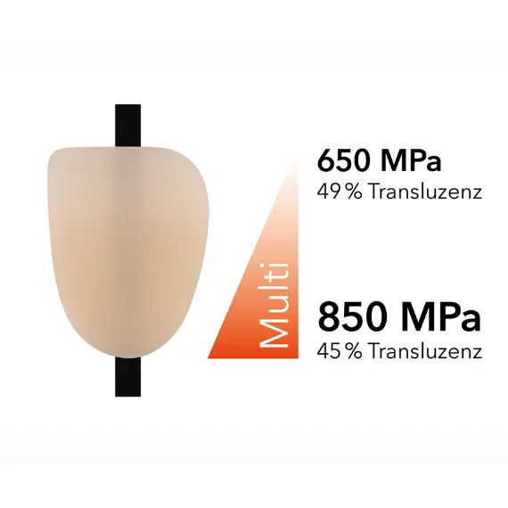 NexxZr+ Multi is a dental multilayer zirconium oxide (4Y-TZP cervical, 5Y-TZP incisal) with natural color and translucency gradient and high flexural strength (850 MPa cervical, 650 MPa incisal).