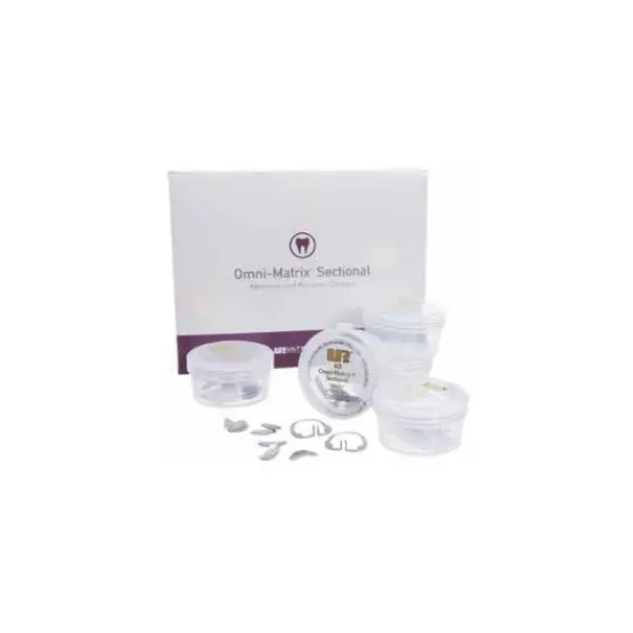 Omni-Matrix Sectional bands conform to the natural anatomy of the tooth, while the clamp tines provide multiple contact points. The specialized band contour ensures the edge of the matrix will not catch on the gingival margin during placement. The retainer clamps stack easily, allowing both sides of the tooth to be held in a matrix at the same time. The retainer can be placed with any rubber dam forceps or sectional matrix forceps. The bands are interchangeable with all brands of sectional retainers.