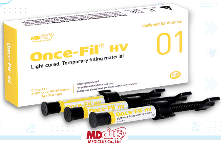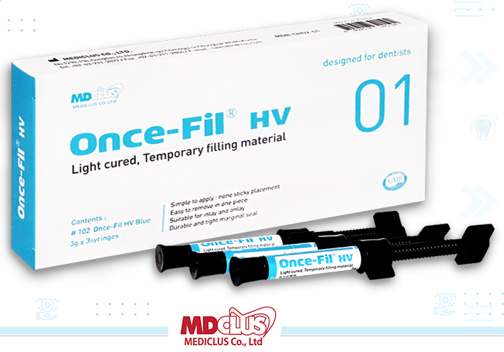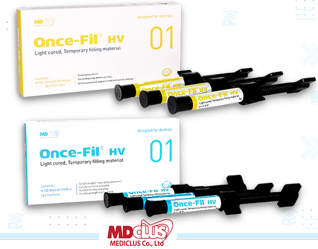 Once-Fil HV is a light curing temporary filling material. Due to its elastic and high viscous characteristics, it can be used simply, easily and suitably for temporary filling such as in-lays and on-lays.