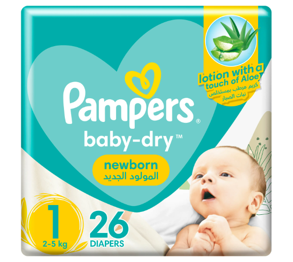 - With the addition of moisturizing aloe vera lotion, Pampers Baby-Dry Newborn Taped Diapers offer your bundles of joy protection against rashes and up to 100% leakage cover for over 12 hours to keep their skin healthy, dry, and soft.