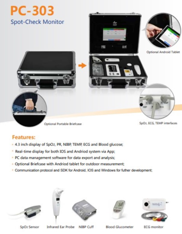 - The PC303 device can measure several important vital signs for patients, including blood pressure, blood oxygen level, heart rate, and body temperature.
