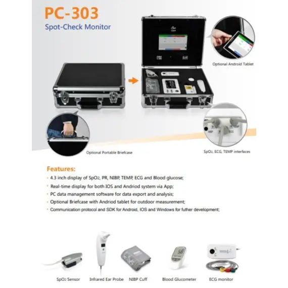 - The PC303 vital signs monitor is characterized by its portable and compact design, making it easy to carry and use anywhere, whether at home or in the hospital.