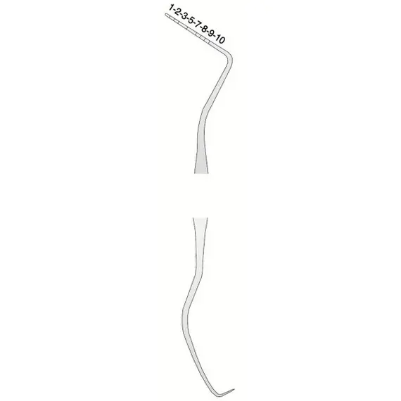 Markings: mm1-2-3-5-7-8-9-10 To measure pocket depths around a tooth in order to establish the state of health of the periodontium with its long, thin, and blunted tip. Color coded points used to measure periodontal pocket depth and attachment levels in millimeter increments.