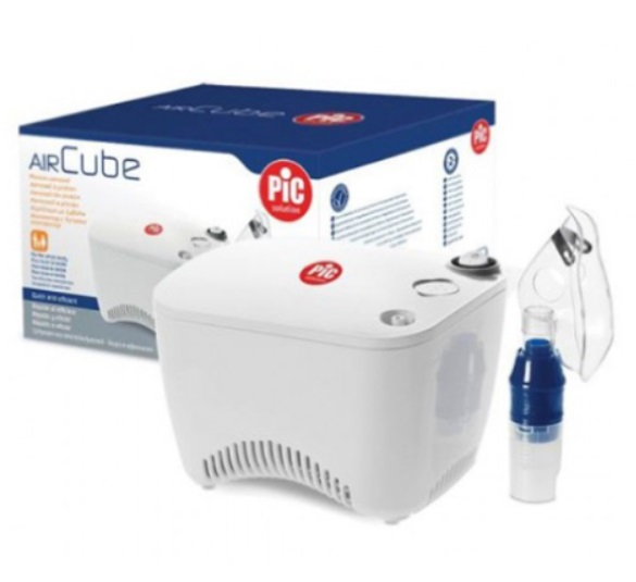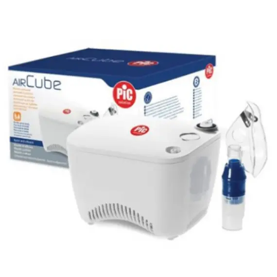 The PiC AIR Cube is a portable home nebulizer that converts liquid medication into fine mist for deep airway delivery. Suitable for children and adults, it operates quietly and includes masks and accessories for easy use.