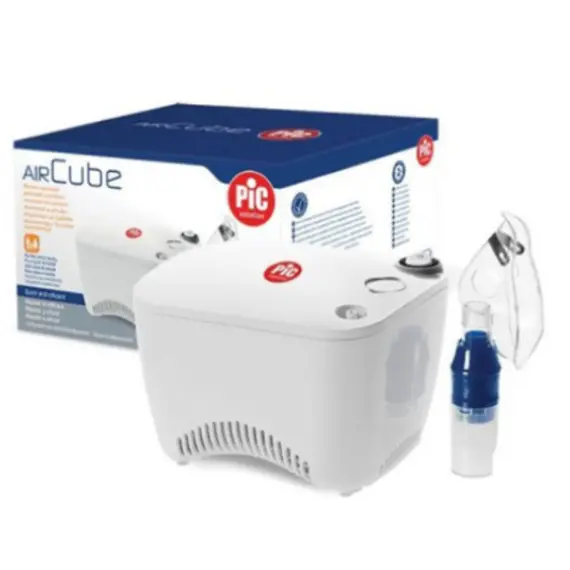 The PiC AIR Cube is a portable home nebulizer that converts liquid medication into fine mist for deep airway delivery. Suitable for children and adults, it operates quietly and includes masks and accessories for easy use.