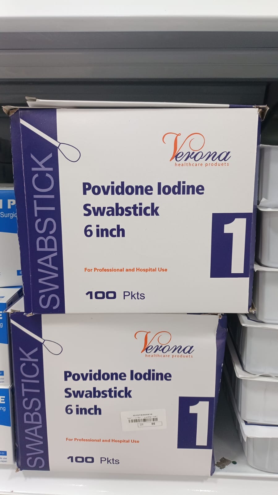 Plastic swabs with a cotton tip saturated with povidone-iodine 10%.