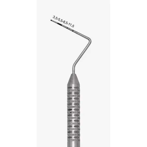 Blue Titanium Markings: mm3,5-5,5-8,5-11,5, Color Coding: between 3.5-5.5mm, (AKA: Community Periodontal Index of Treatment Needs, CPITN Probe or WHO 621 Trintity) Periodontal probes are used to locate, measure and mark pockets, as well as determine their course on individual tooth surface. The typical probe is a tapered, rod-like instrument calibrited in millimeters, with a blunt rounded tip.