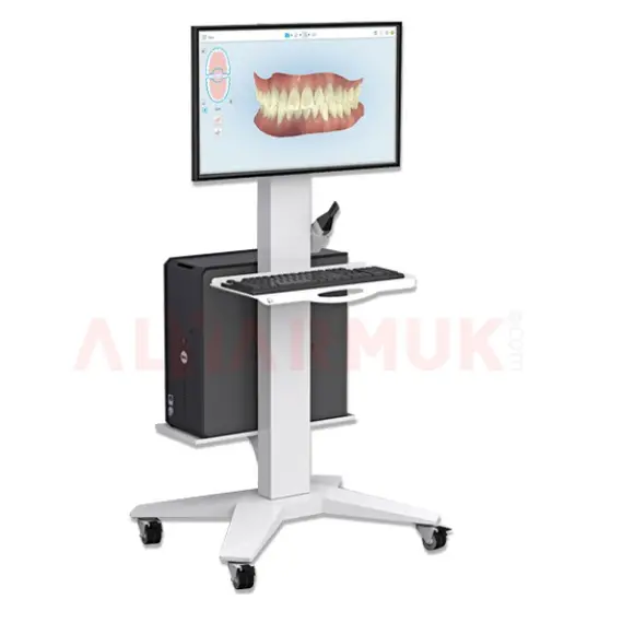 The mobile medical computer cart, 135 cm high, 55 cm wide, and 40 cm deep, features a shelf for an intraoral scanner, an adjustable keyboard tray, side power outlets, and supports a 32-inch screen. Made of galvanized steel with an epoxy coating.