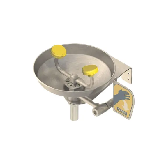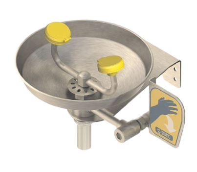 - محطة غسل العين مزودة بصنبوري مياه موجهين للأعلى لإدخال الماء في العينين بسهولة.