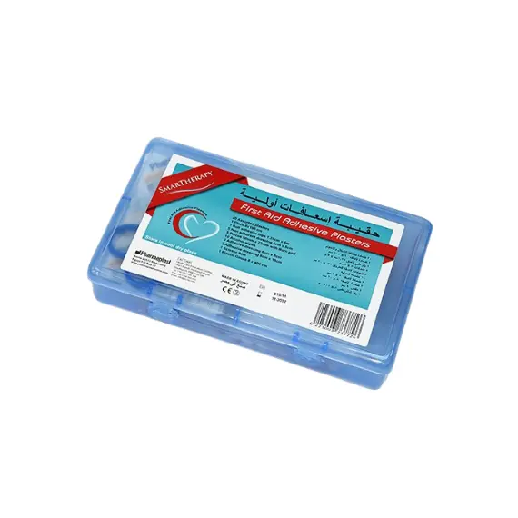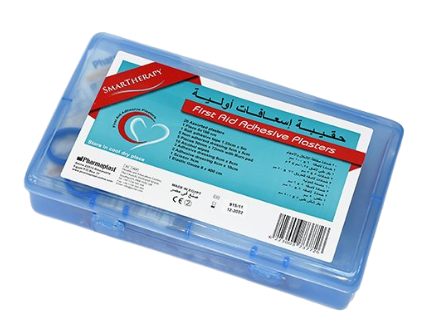مواصفات شنطة اسعاف أولية مليئة بلاسترز: شنطة إسعافات أولية من الضروري توفرها في كل منزل ومكتب وسيارة للحالات الطارئة. تحتوي على عدة أنواع من الضمادات: عدد 1 ضمادة لاصقة 6 سم ×1م عدد 1 بكر/ رول طبي لاصق 1.25 سم × 5 م عدد 5 ضمادات مقاس: 5×5 سم عدد 5 ضمادات لاصقة للحروق 5×7.2 سم عدد 10 مسحات كحولية عدد 3 ضمادات لاصقة 8×6 سم عدد 3 ضمادات لاصقة 8×10 سم عدد 1 مقص 9 سم عدد 1 بكر/ رول شاش طبي 8 سم × 4 م صغيرة الحجم وخفيفة الوزن. علبة أنيقة للحفظ والتخزين. العلامة التجارية SMART THERAPY