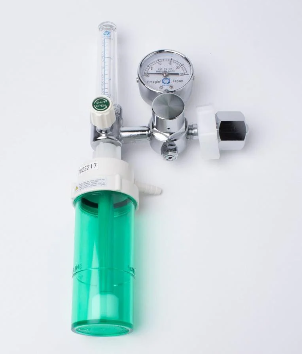 - The oxygen cylinder regulator features a water bottle that functions as an air humidifier.