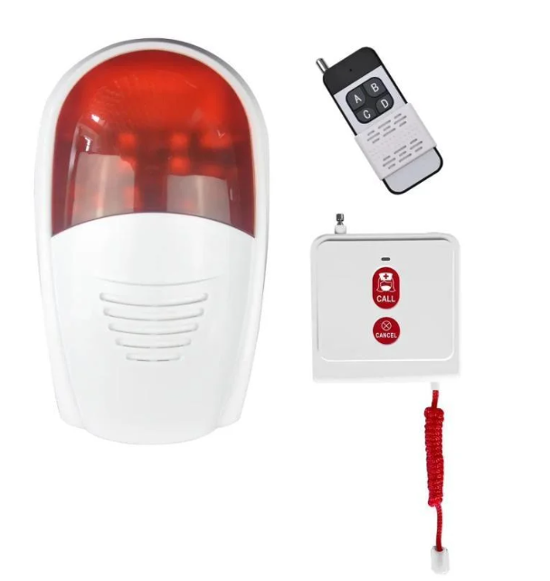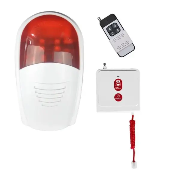 An emergency call device is used by pressing it or pulling the cord to summon help via an outdoor receiver. It features sound and light and comes with an additional portable remote.