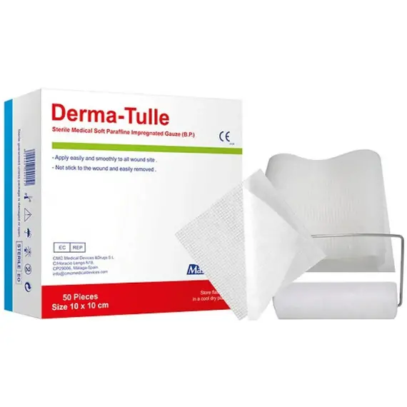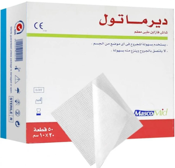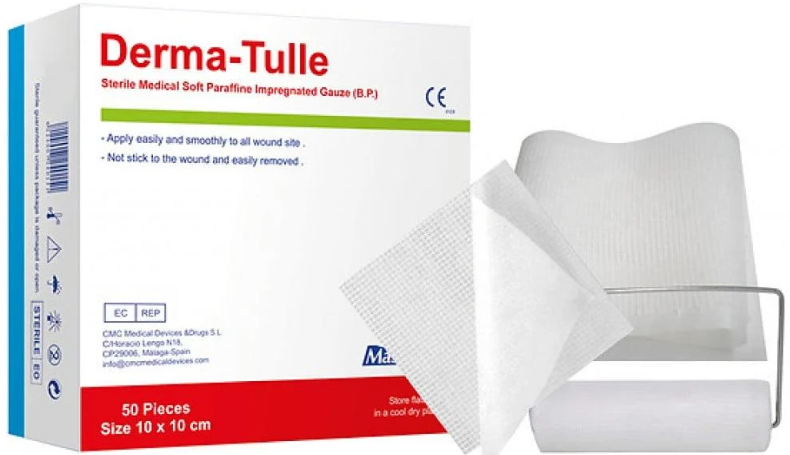 Dermatol petroleum jelly gauze reduces pain and damage from changing dressings on wounds or burns.