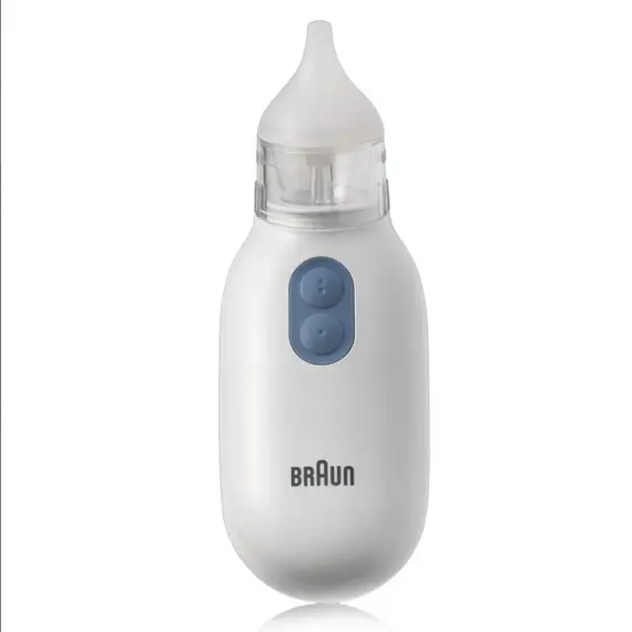 Great. No need for complicated manual devices with the Braun nasal aspirator. Choose from two comfortable tips for a snug fit and two suction settings for effective relief. The Braun nasal aspirator works quietly and quickly to clear congestion. Plus, the easy-to-clean parts are dishwasher safe.Stress-free relief for you and your baby. No need for manual suction - our battery-operated device gently clears congestion. Calm and comfortable - for stress-free nasal congestion relief. Two gentle settings - start with the lowest suction setting and increase it if needed. Two convenient tips - choose the right size for your baby's nostrils.The larger, improved perforations on the tips will allow for a wider suction area. The parts are dishwasher-safe, making cleaning easier after each use. Insert the device correctly into your child's nostril; it must be snug enough for the device to function properly. Click to see other healthcare products.