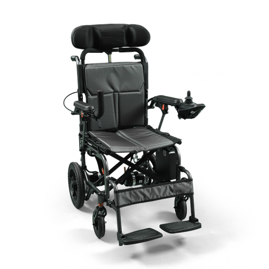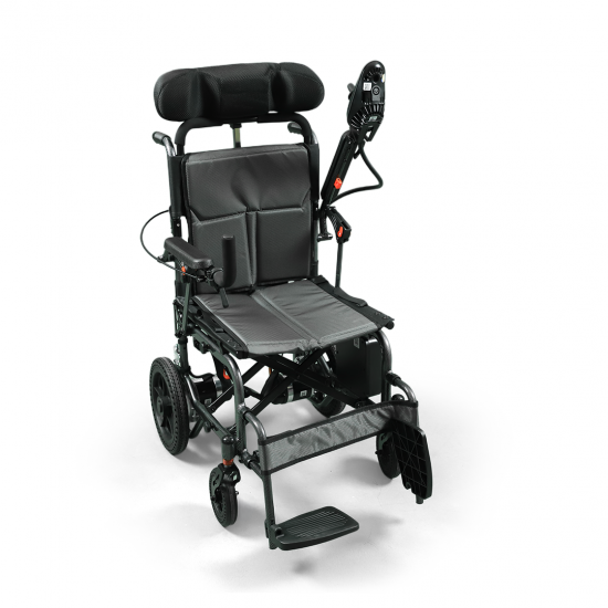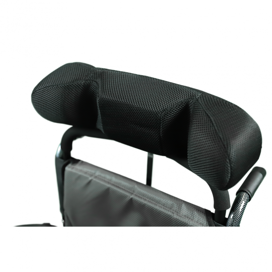 A comfortable wheelchair with a smart design and strong aluminum frame, featuring an adjustable headrest that provides extra comfort while sitting or relaxing.