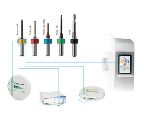 A wide selection of tools gives users a variety of processing possibilities. PrograMill tools are specifically designed for different CAD/CAM materials and colour coded by means of a ring on the shaft. Every colour represents a different material. The materials are also marked accordingly. Colour coding is also used in the operating panels of the PrograMill machines. This allows intuitive and easy tool management.