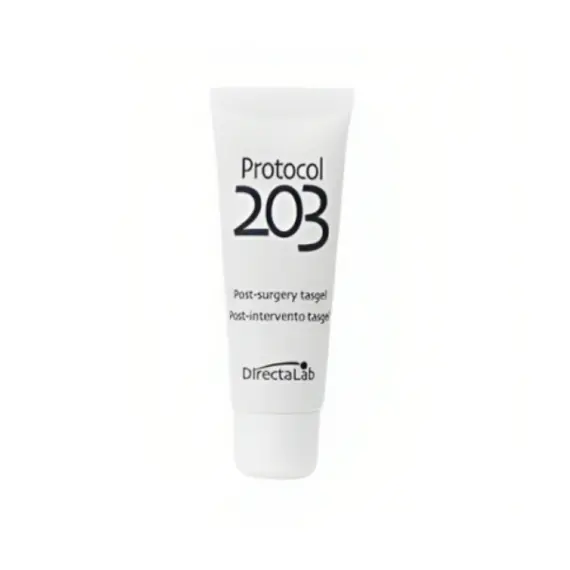 Protocol 203 uses a post-operative gel to minimize the appearance of scars, including raised (hypertrophic) and depressed (hypertrophic) scars. It also helps reduce itching, redness, and pain in the affected area.