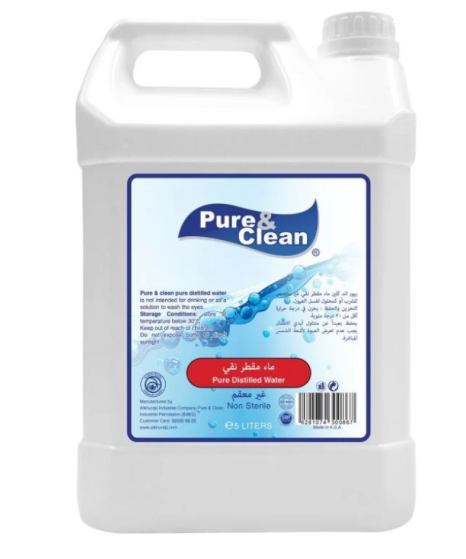 منتج يتميز بنقاوة عالية وتصفية فائقة. يتم استخدامه في المستشفيات والمراكز الطبية والمستوصفات ومراكز تجهيز الأطعمة. يعتبر هذا الماء مقطرًا نقيًا بنسبة 100٪ وغير مخصص للاستخدام كمشروب أو كمحلول لغسول العدسات. ويتمتع بيور اند كلين ماء مقطر بالمواصفات والمعايير العالية، يساهم في المحافظة على نظافة وسلامة المنتجات والبيئة.