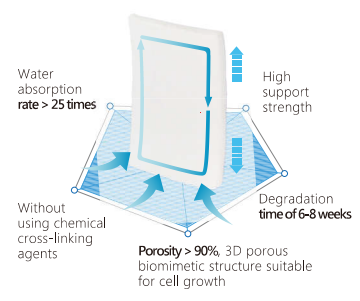 The porous and highly porosity sponge structure absorb blood and wound secretions and promote platelet aggregation. Filling wounds with Regen can prevent persistent cracks caused by the contractionof blood clot or bacterial infection from saliva contamination.