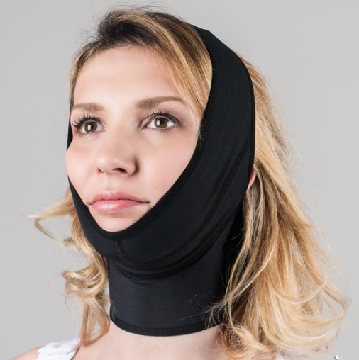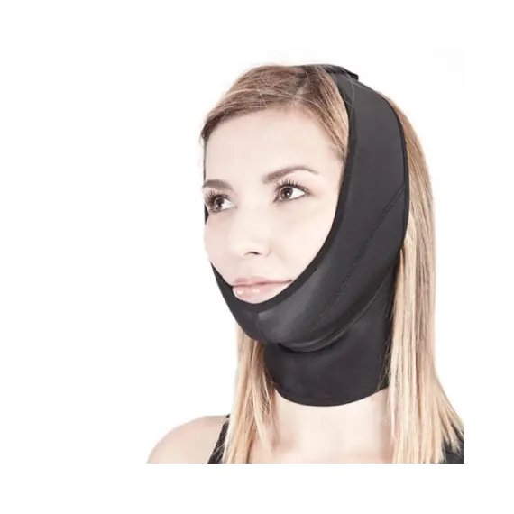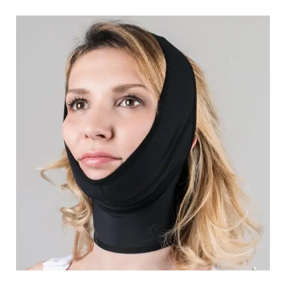 مشد مستخدم بعد عمليات شد الوجه ورأب الذقن. إنها تتكيف بشكل مثالي مع شكل الوجه. يسهل الإغلاق بخطاف وحلقة الاستخدام، مما يضمن الضغط الصحيح على الوجه والذقن.