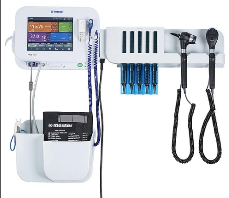 The RVS-200 is a versatile, wall-mounted, integrated diagnostic station that, like the RVS-100, measures pulse rate (PR), oxygen saturation (SpO2), non-invasive blood pressure (NIBP), and temperature (oral/armpit probe), with the additional option of adding ophthalmoscopes, otoscopes, and dermatoscopes.The flexible modular design offers many configurations and settings to suit the needs of hospitals and clinics, as well as long-term care settings and offices.