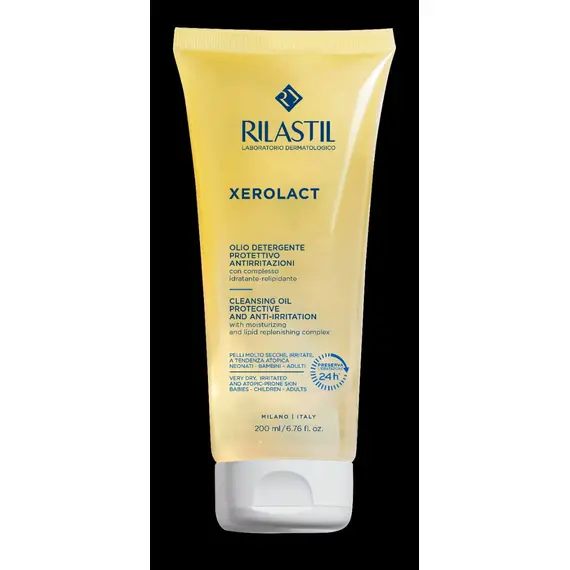 A cleansing solution that targets severe dryness, sensitivity and itchiness. Suitable for fragile and atopic skin, this cleansing oil focuses on restoring the skin’s natural barrier and in providing intense hydration. Therefore, after each use, you will notice how your skin is visibly nourished and soothed with a comforting feeling. ou and the whole family may use the Rilastil Xerolact Cleansing Oil to effectively cleanse the skin of both face and body. This product does not irritate the eyes.