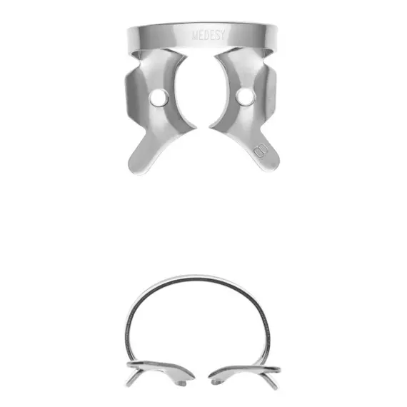 Used to anchor a rubber dam down to the cervical region of an exposed tooth. This device comes in a variety of shapes, sizes, and designs for various situations. It is typically made of spring metal and has bevelled jaws that contact the tooth, and a bow that connects the jaws. Festooned jaws for general purposes on upper molars. Jaws fit the gum curvature